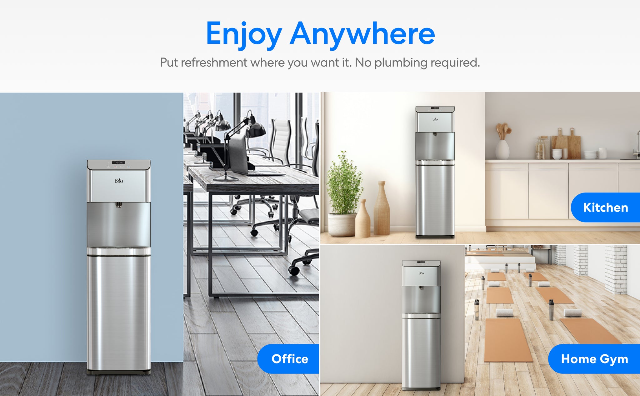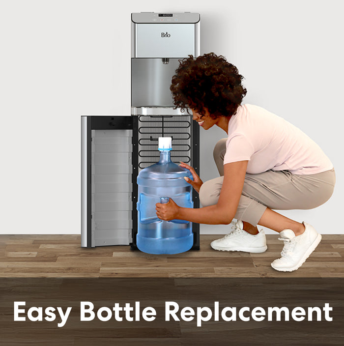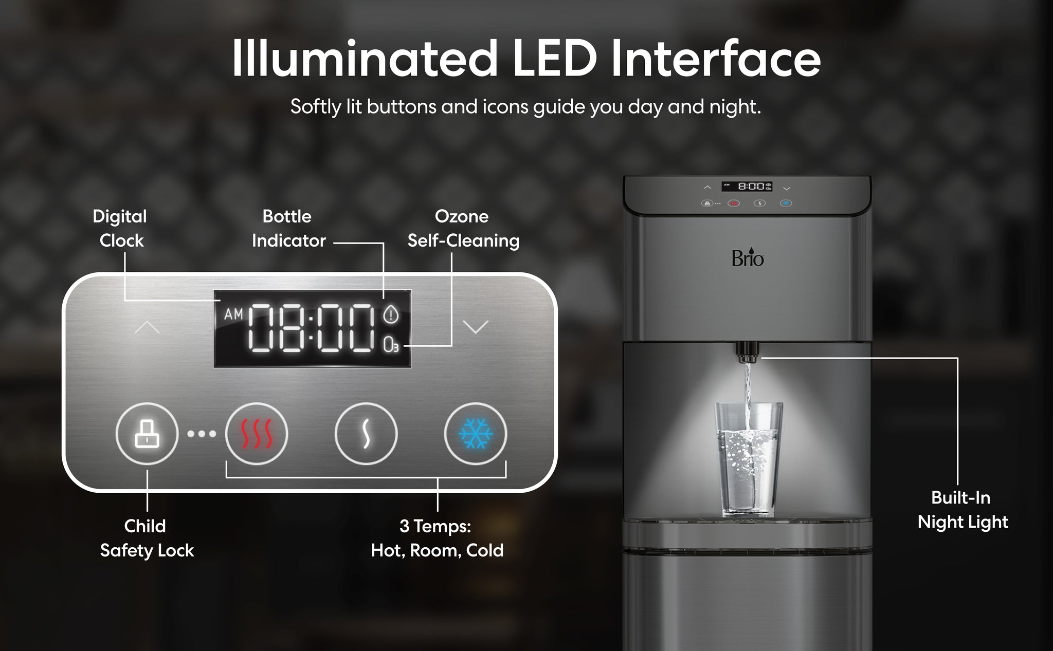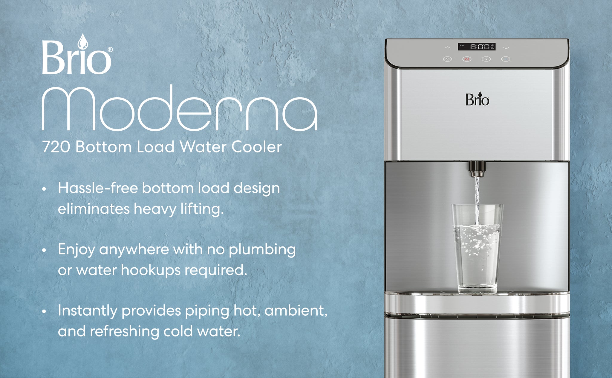 Part of the Moderna Collection, the Brio Moderna Self-Cleaning Bottom Load Water Cooler is engineered with innovative technology and features a sleek modern design. The advanced LED display and intuitive touch buttons elevate your experience, and the stainless steel construction with modern profile will upgrade the décor in any room.