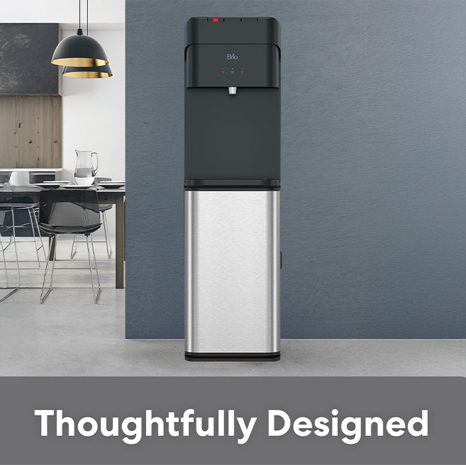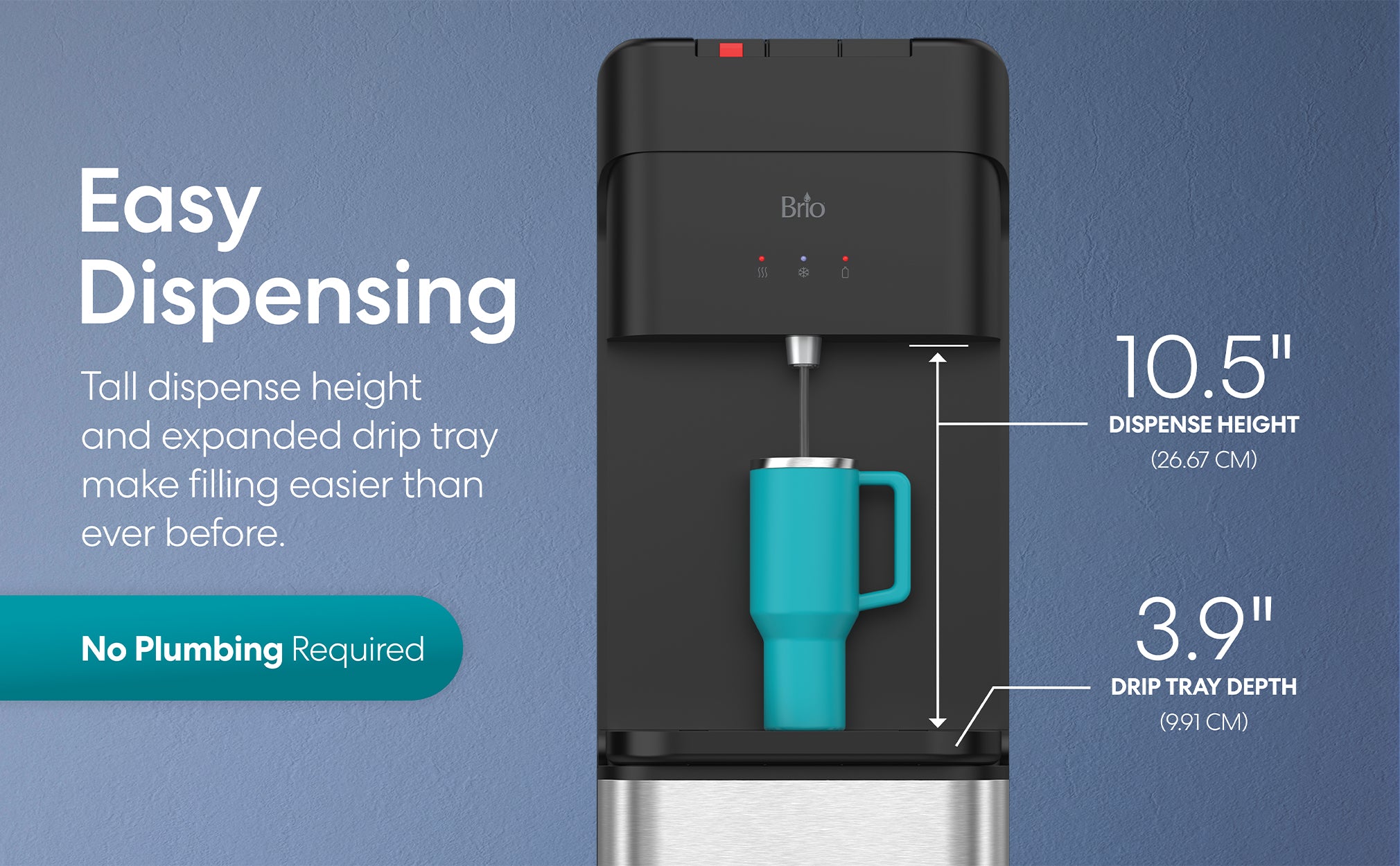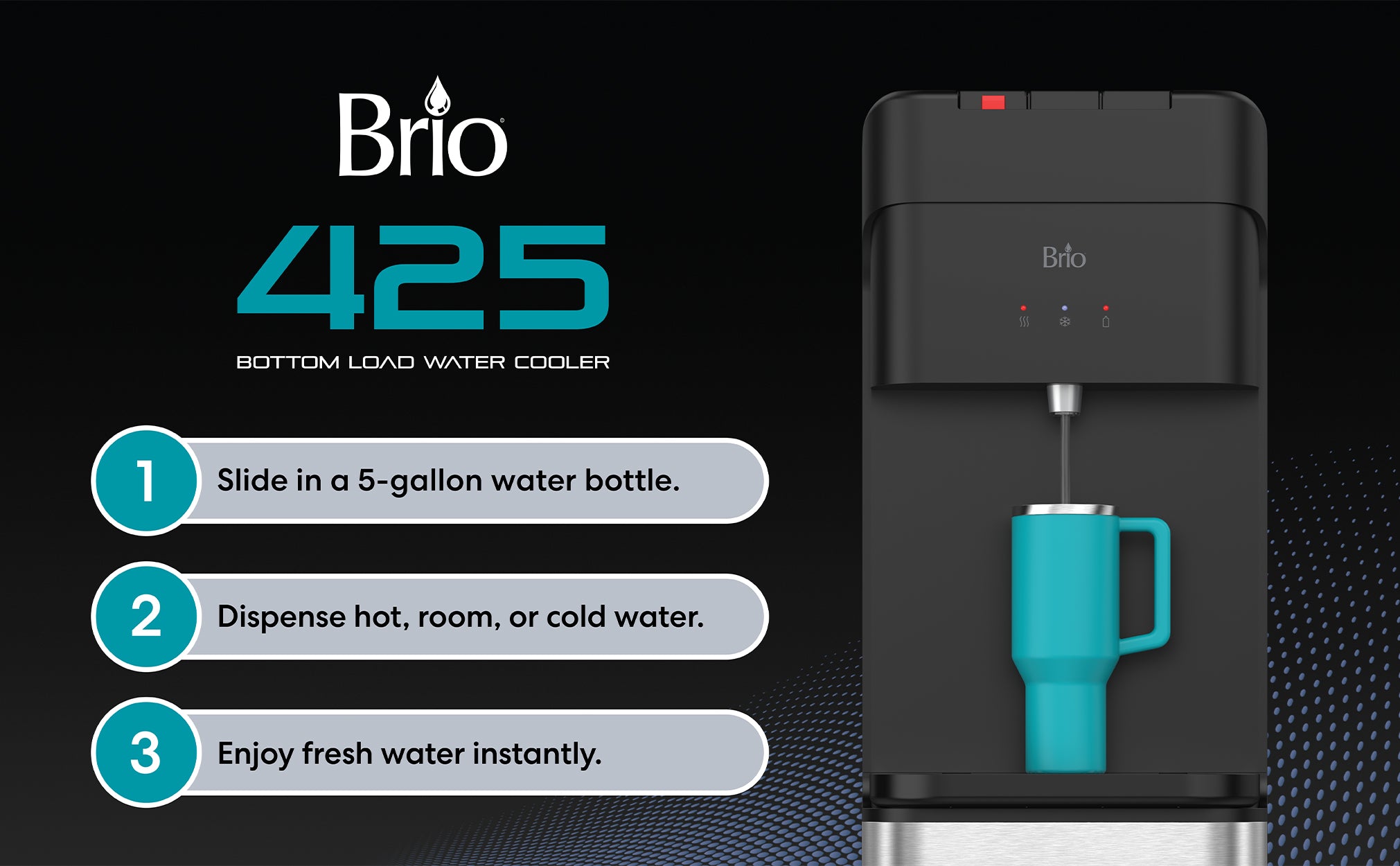 The Brio 425 Bottom Load Water Cooler is a convenient hydration solution with a modern design and advanced features. It is constructed with a durable polymer exterior, features tri-temperature dispensing, a tall dispense height that makes filling large bottles and pitchers easy, and bright indicator lights to keep you informed. Plus, it has a hassle-free bottom loading design that makes bottle replacement easy and eliminates heavy lifting.