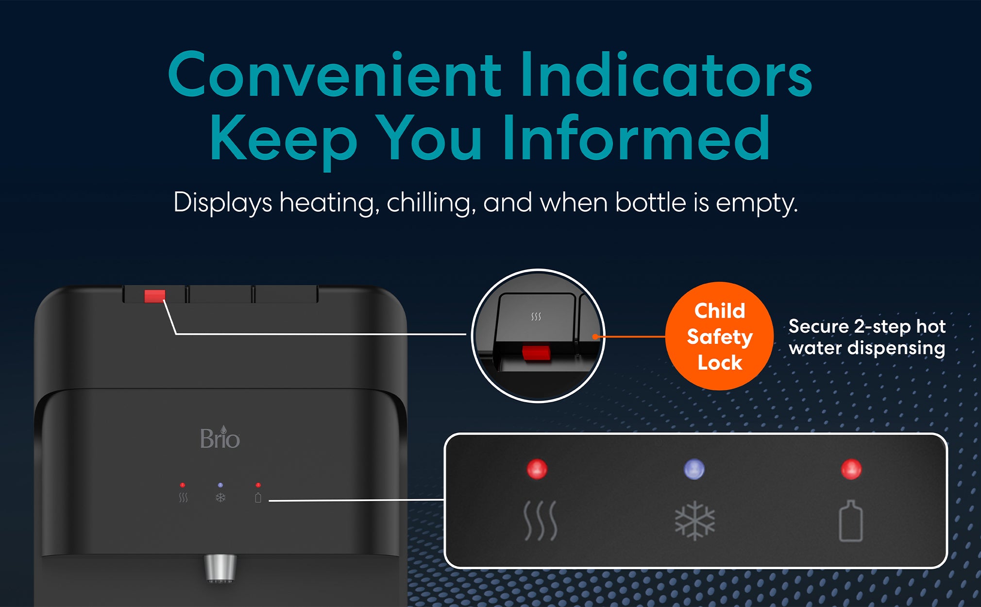 • LED notification lights: bright indicator lights alert you when water is heating, cooling, and when water supply is running low