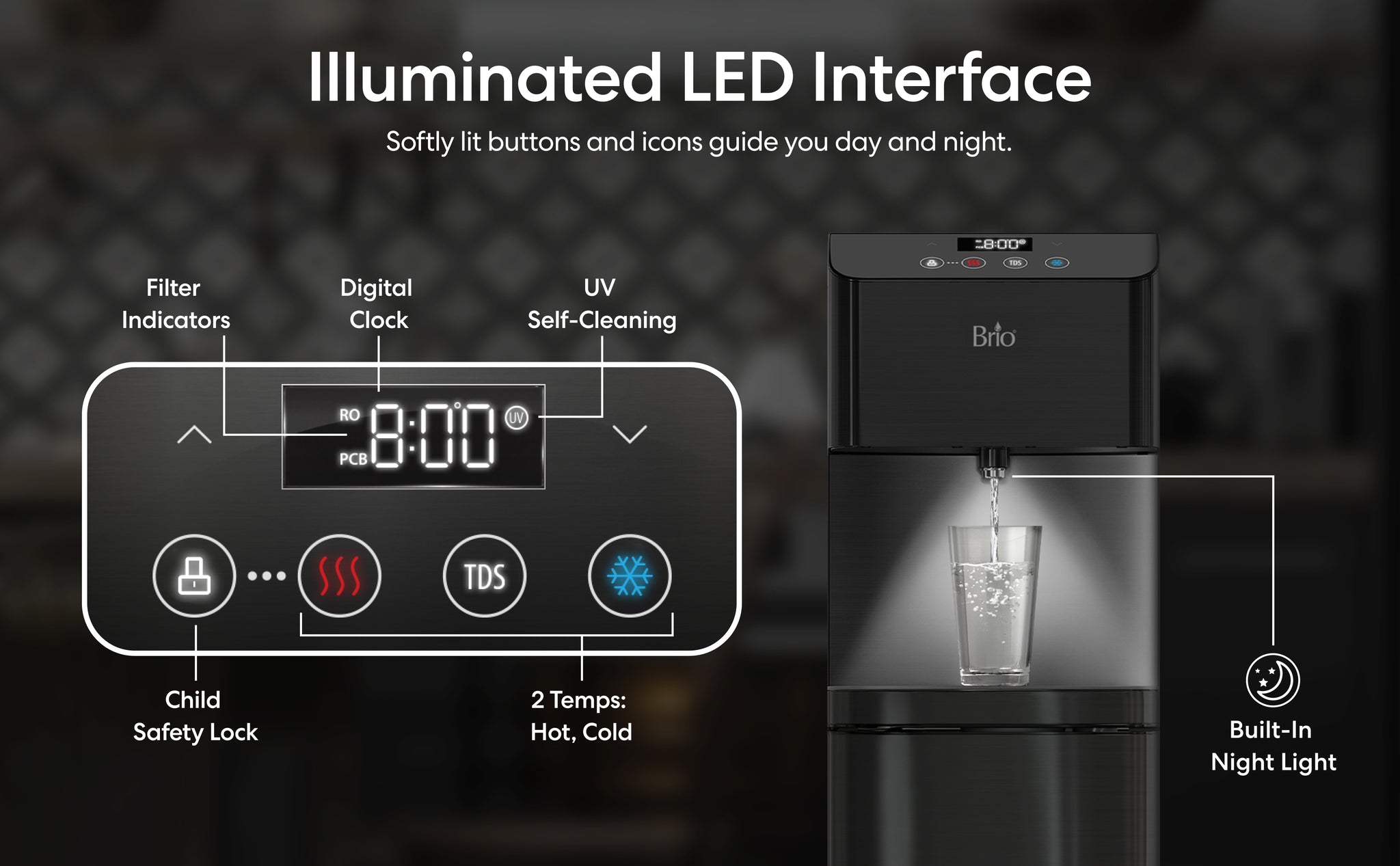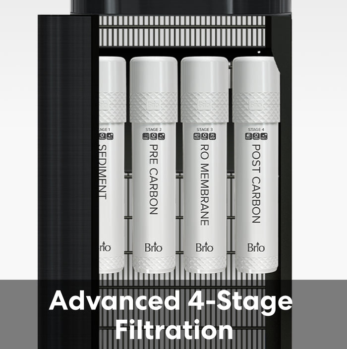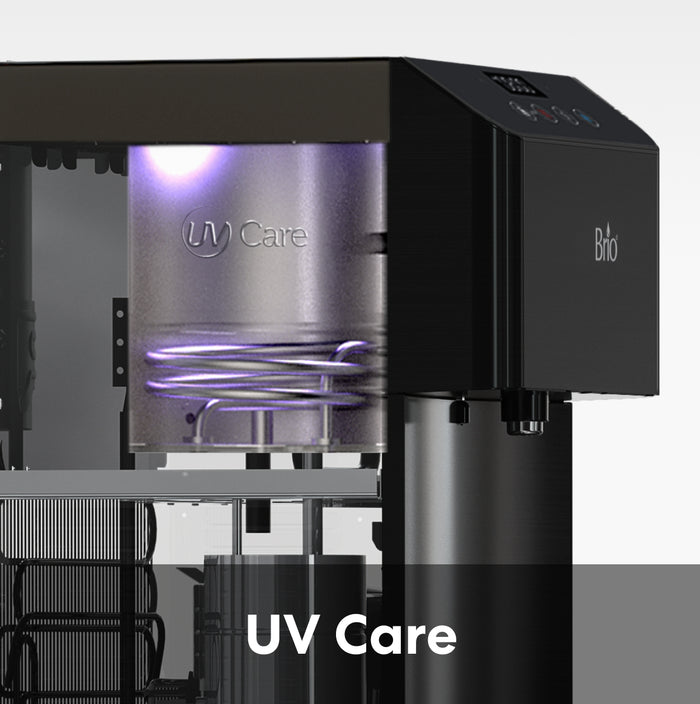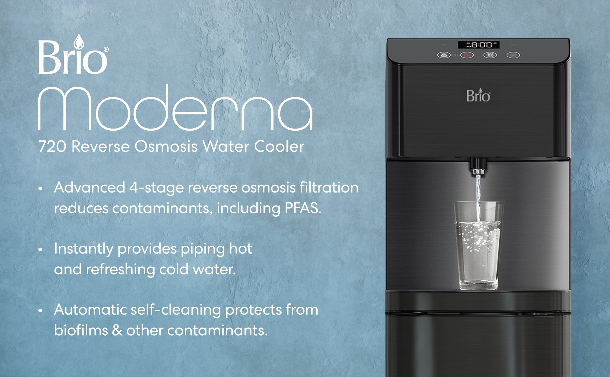 The Brio Moderna RO Bottleless Water Cooler is engineered with innovative technology and features powerful 4-stage reverse osmosis water filtration. The self-cleaning UV Care system automatically disinfects your cooler, and the stainless steel construction with modern profile will upgrade the décor of any room. First set of filters included.