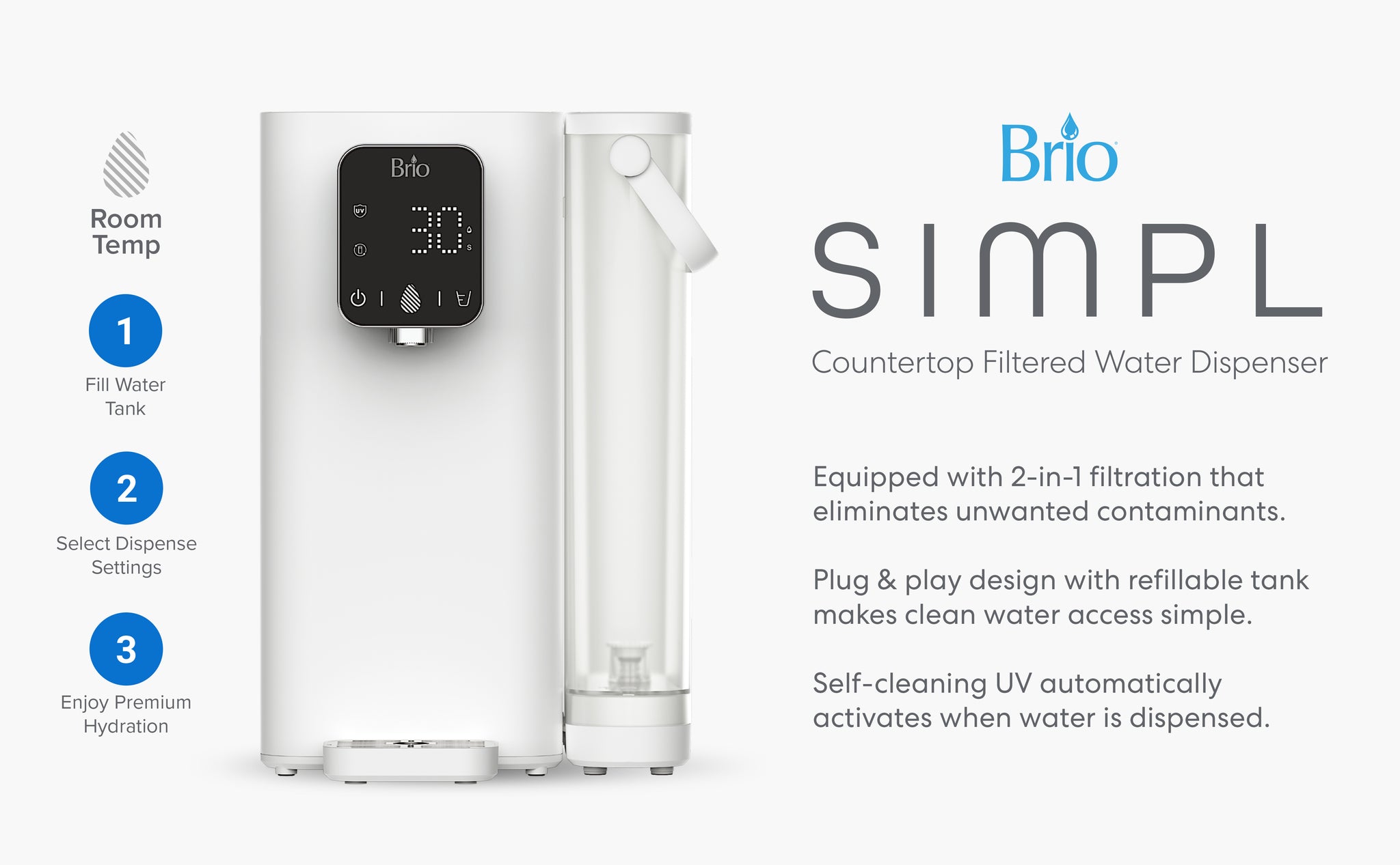 The Brio SIMPL 2-Stage Countertop Water Dispenser features a digital display panel with touch icons for UV, filter reset, power, water level, dispense timer, and time selector. Its bright LED shows “30” above the refillable filtered water tank.