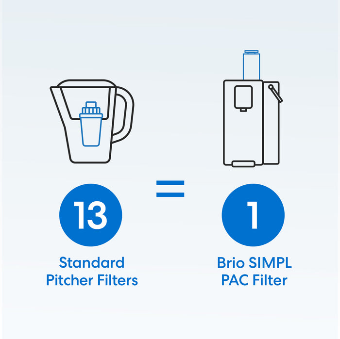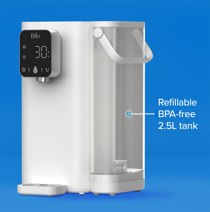 The compact and convenient Brio SIMPL W2 Countertop Water Dispenser with 2.5L Refillable Tank is a straightforward clean water solution that provides delicious, filtered water and requires no plumbing or hookups. It is built with 2-in-1 filtration, user-friendly touchscreen, tall 8.5” dispense height, self-cleaning UV, and a sleek compact design that fits virtually anywhere. Plus, the long-lasting filter PAC filter lasts up to 528 gallons or 12 months for added long-term savings.