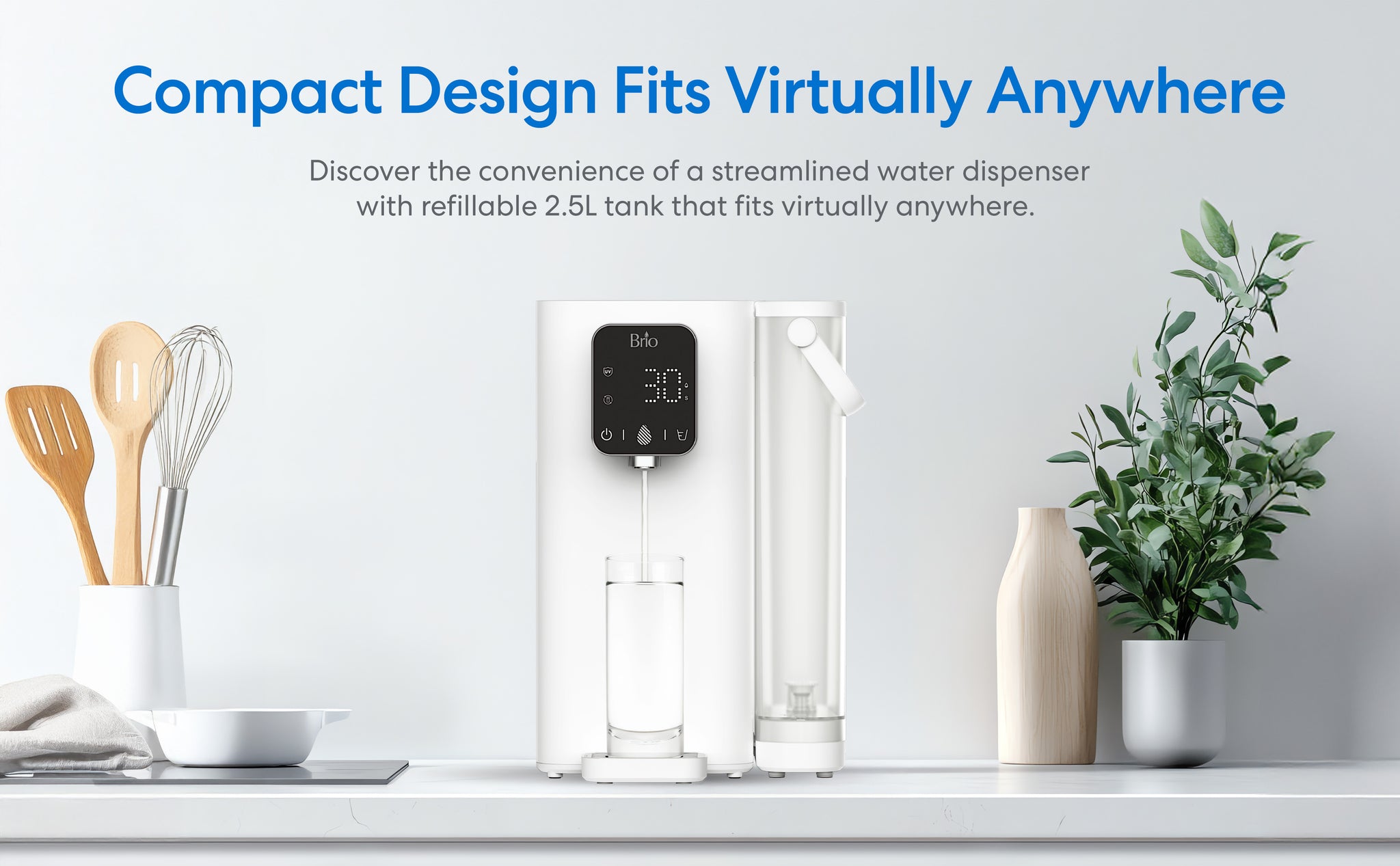 The Brio SIMPL 2-Stage Countertop Water Dispenser with a digital display sits on a kitchen counter by utensils, a plant, and a cup being filled. Features include a 2.5L refillable tank and suitability for kitchens or offices.