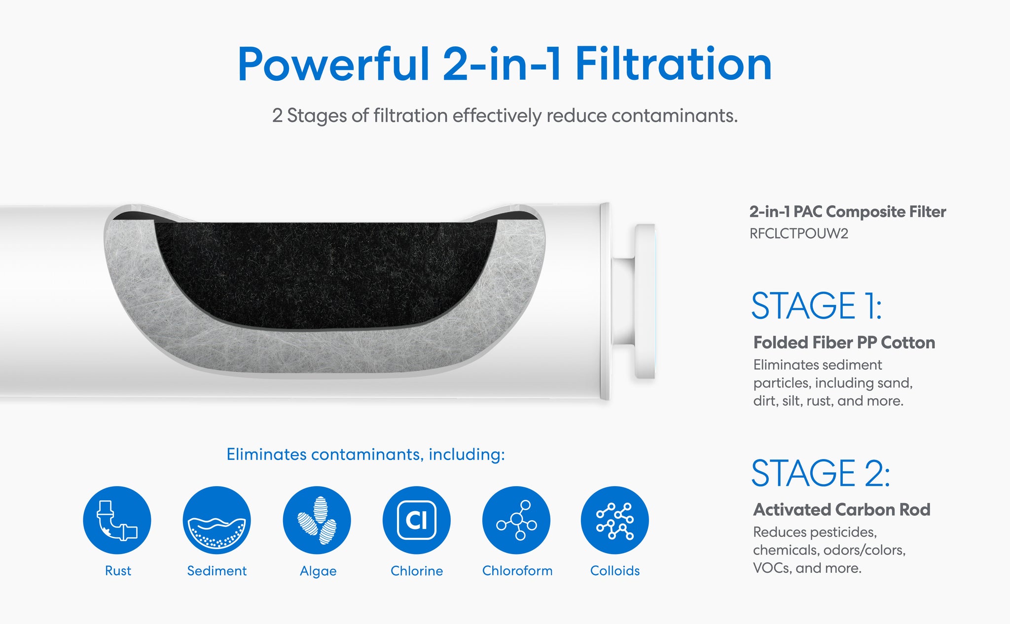 • Powerful filtration: 2-in-1 composite filter features polypropylene layer that tackles dirt, silt, and other sediments, and a center carbon block rod that absorbs contaminants like chlorine and VOCs