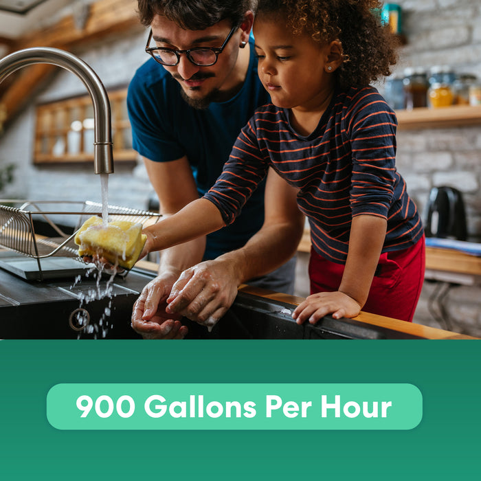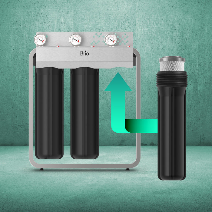 The efficient and reliable Brio 3-Stage Whole House Filtration System – Heavy Metals reduces harmful metals. Housed in a durable stainless steel frame that can sit on the floor or be wall-mounted, this comprehensive system features a sediment filter, GAC + KDF filter, and CTO filter to intercept heavy metals, including lead and mercury which can have a negative impact on your health. Plus, this system is installation ready with 1” connections to deliver water throughout your home without pressure loss.
