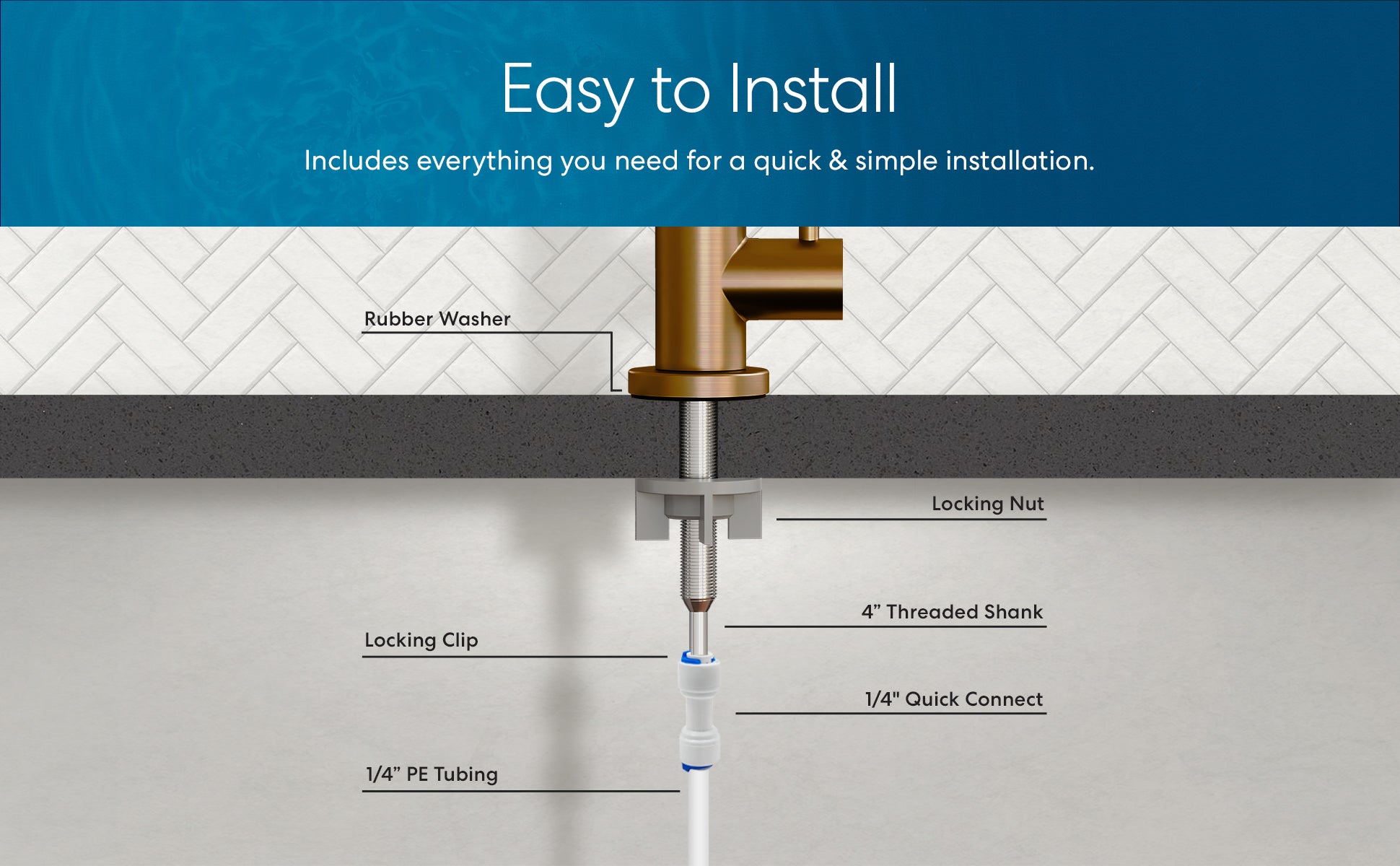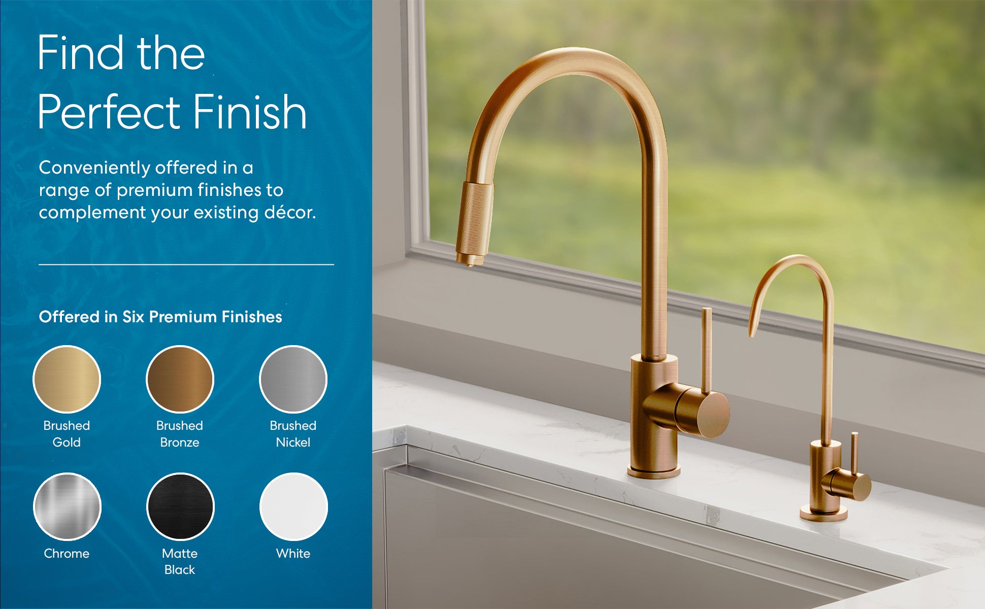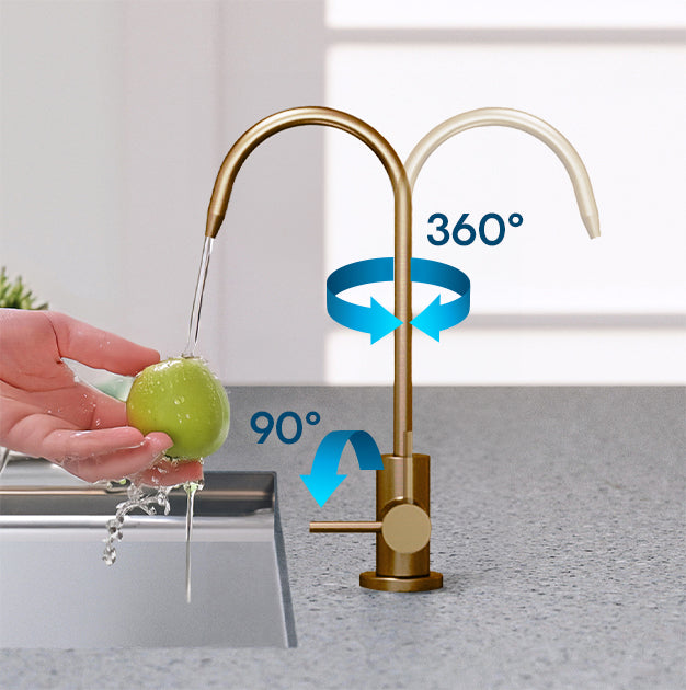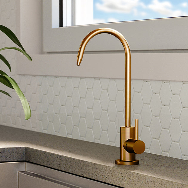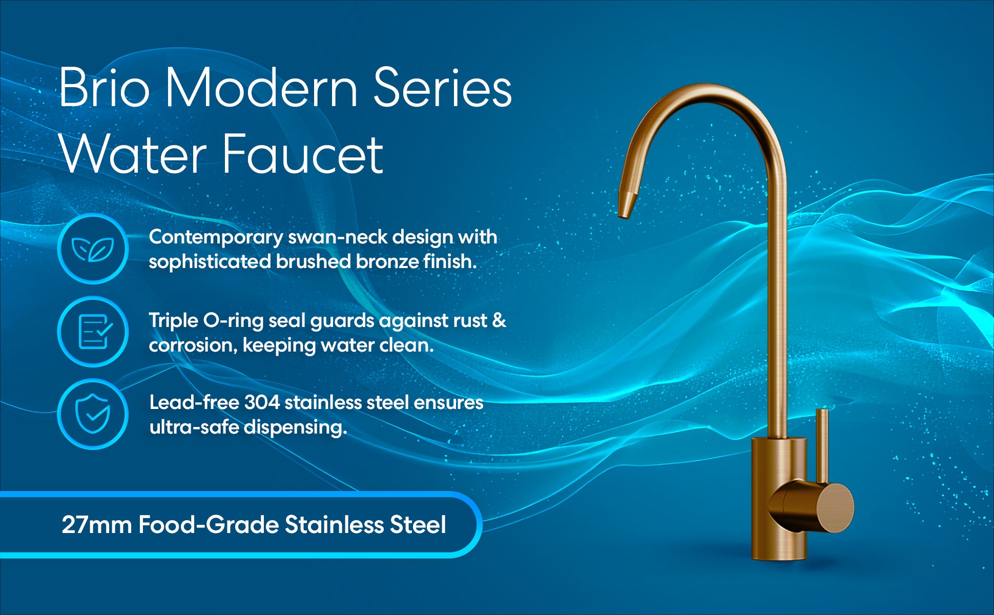 The Brio Modern Series Water Faucet in Brushed Bronze is an elegant addition to your home water filtration system. It has a contemporary design with lead-free stainless steel construction and tapered spout to ensure you’ll enjoy a steady splash less stream of water. Plus, the Brio Modern Series Water Faucet has a 360-degree swivel neck for effortless directional pouring and a 90-degree handle for easy operation.